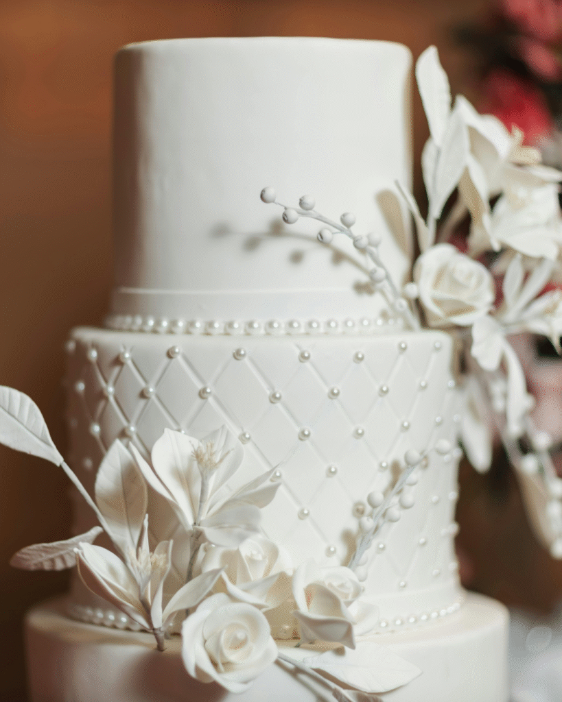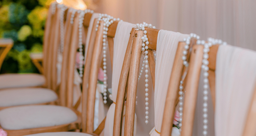 - Dekorace: perlové girlandy, jmenovky nebo detaily na dortu propojí styl nevěsty s celkovou estetikou svatby.
